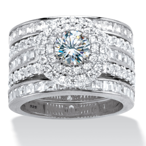 Get ready to wow them all with this gorgeous cubic zirconia bridal ring set. Featuring a large round center stone surrounded by a double halo and several rows of smaller rounds and baguettes, this 3-piece set creates quite the statement on your finger. With 3.60 carats T.W., it's set in platinum-plated sterling silver. Sizes 6-10.