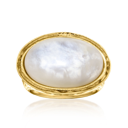 With a commitment to quality and affordability, Ross-Simons presents timeless jewelry for the modern woman. Lovely and luminous, our ring features a shimmering 15x22 oval mother-of-pearl cabochon in a sunny setting of 18kt yellow gold over sterling silver. Textured and polished finishes. 5/8' wide. Mother-of-pearl ring. Each Ross-Simons item arrives in a fine jewelry presentation box. Shop Ross-Simons jewelry risk-free as all items include a 30-day, 100% money-back guarantee.