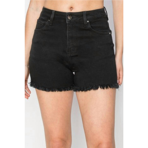 Jean shorts so versatile, you can literally wear them with anything.Elevate your summer wardrobe with the Zion High Rise Basic Shorts by RISEN, perfect for a stylish vacation look. Designed with a fray hemline and crafted from comfort stretch denim, these shorts provide all-day ease and chic appeal. Featuring a pull-on closure, they offer a flattering high-rise fit with a rise of 10.5' and an inseam of 3.5'. Care instructions - Machine wash as needed to maintain their solid black wash.