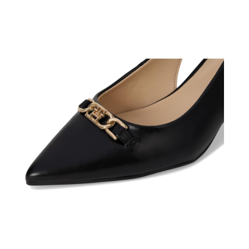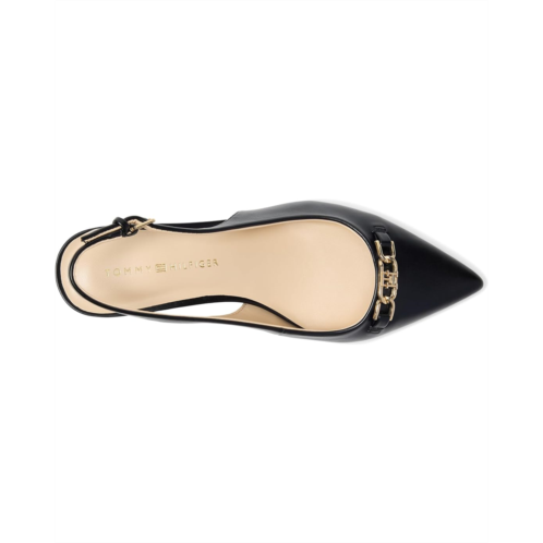 - The Tommy Hilfiger Tienna pumps with gleaming signature metallic logo hardware highlight their pointed toe shape. These heeled pumps are designed with a slingback strap with an adjustable buckle closure for a secure fit. They are made of a faux leather upper, foam footbed, and polyester lining.