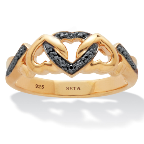 Celebrate romance with a ring of interlocking hearts twinkling with brilliant black diamond accents. It's the perfect sweetheart choice styled in 18k yellow gold-plated sterling silver. Sizes 6-10.