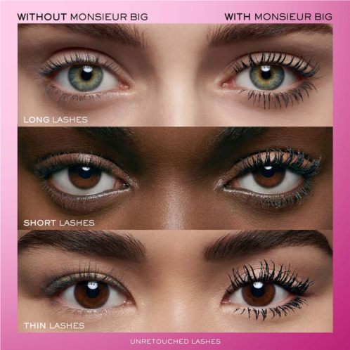 Everything you love about Monsieur Big?now in a waterproof formula. The Monsieur Big Mascara features a large brush and a sweat-proof, smudge proof formula that glides onto lashes like silk and delivers exceptional volume for up to 24 hours of wear. This waterproof mascara doesn’t require touch-ups and doesn’t flake.