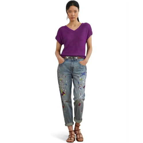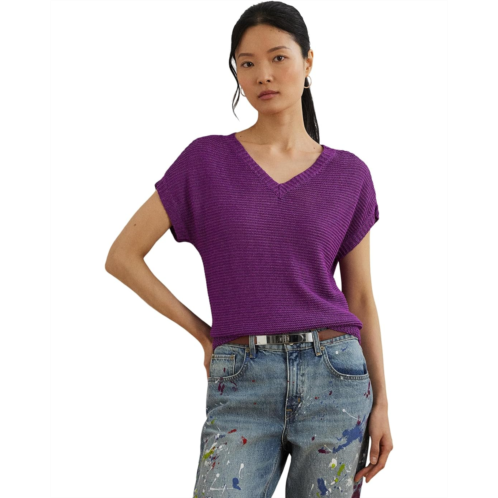 Cut for a relaxed-fitting silhouette that slightly tapers at the hip, the Lauren Ralph Lauren Linen-Blend Short-Sleeve V-Neck Sweater's short-sleeve design and lightweight linen-blend fabrication make it a perfect piece for transitional dressing. Intended to hit at the hip, this pullover sweater is styled with a ribbed V-neckline, short Dolman sleeves with ribbed cuffs, and a rack-stitched hem. Stay comfy and stylish wearing this V-neck sweater.