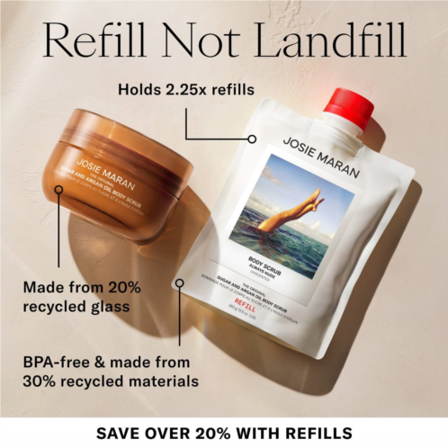 What Else You Need to Know: Sugar crystals attract moisture and gently buff away dead skin without stripping. Responsibly sourced argan oil locks in the moisturizing goodness of shea butter and coconut oil. Presto: A velvety-soft, lustrous-all-over you. With the refill system, top up your amber glass jar and reuse forever.