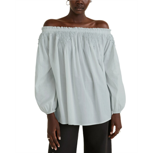 Introducing the Merlette Marle Blouse, a stunning addition to your wardrobe in the beautiful Sea Mist color. This blouse features hand smocked details, an off the shoulder neckline, button cuffs, and is made from 100% cotton for a comfortable and stylish fit. With a length of approximately 23.5 inches from shoulder to hem, this blouse is perfect for any occasion. Hand wash only. Imported.