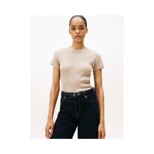 Tommy Hilfiger women's sweater. Our short-sleeve ribbed sweater is made from a viscose-blend for a soft, lightweight feel. Comfortable and versatile, this layer pairs well with anything from relaxed denim to sleek tailoring.