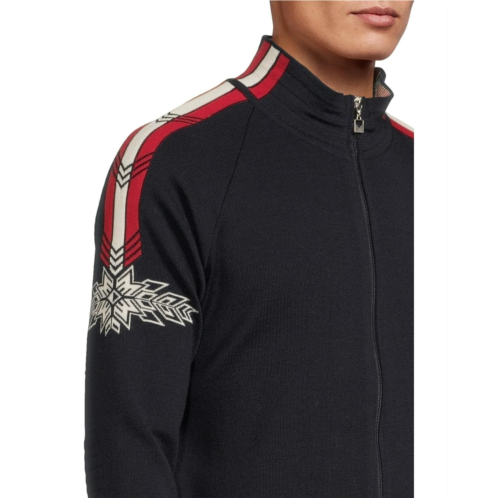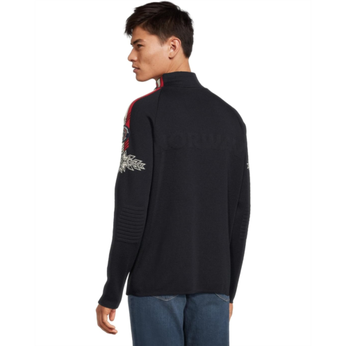 - The Dale of Norway Spirit Masculine Jacket is crafted from skin-soft wool & premium knit quality for maximum comfort, softness, and strength. It features a two-way zippered front closure and a padded flag colored stripes on the shoulders and elbow padding - hints to alpine sweaters from the 70s. This zip-up jacket is styled with long sleeves, a collared neckline, and a straight hem. It's a mid-layer, light knit cardigan that has padded letters spelling 'Norway' knitted discreetly into the back, only revealed when the light casts shadows. Warm, breathable, and form-fitting, this men's cardigan is ideal for skiing or apres-ski.