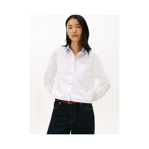 Tommy Hilfiger women's shirt. With a playful twist on a classic design, this boxy-fit shirt is designed with a contrast stripe collar. It's what we do best: timeless pieces made fresh for today.