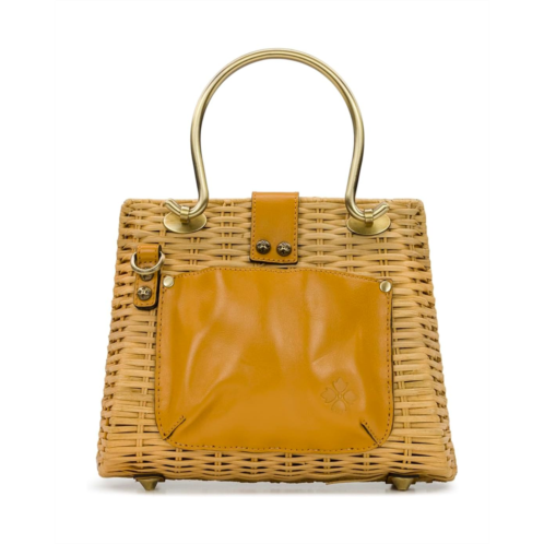 - Breezy elegance, timeless charm - meet the Patricia Nash Rodia Top Handle Bag, a stunning fusion of natural rattan and luxurious full-grain leather trim. Designed for effortless sophistication, this beauty features signature brushed brass hardware, handcrafted stitching, and a chic twist-lock closure for vintage appeal. The spacious interior, lined in soft faux suede, offers a zippered pocket and two slip pockets for easy organization, while the exterior slip pocket adds quick-access convenience. A detachable crossbody strap and protective metal feet ensure both versatility and durability. Finished with a delicate Spring Multi print scarf, the Rodia is your perfect companion-whether it's a sunlit picnic, a seaside escape, or the boardroom.