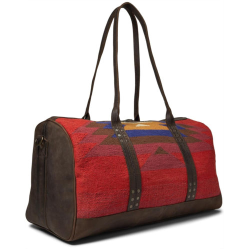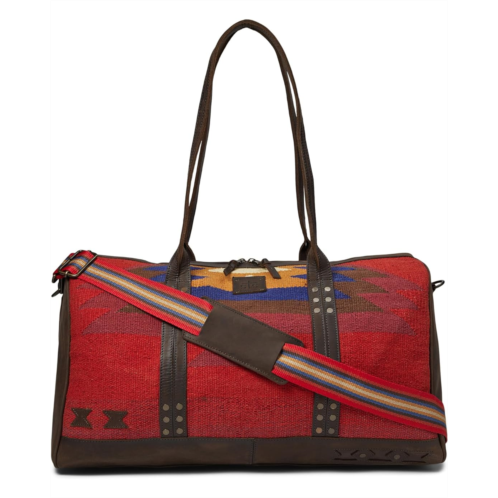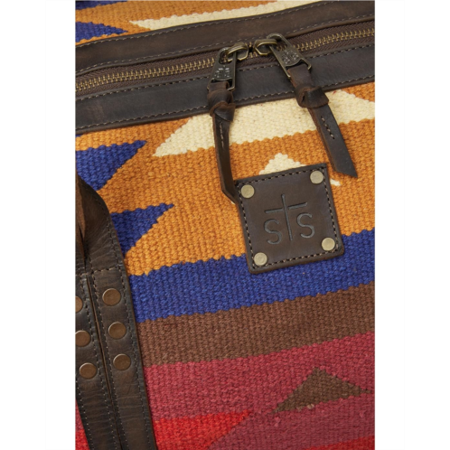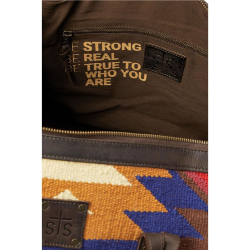 - STS Ranchwear Crimson Sun Duffel showcases a striking fusion of a vibrant serape and full-grain leather trims and impresses with the traditional Aztec and ombre patterns along with its spacious silhouette. The bag is designed with a zippered top closure visualizing one roomy interior compartment with a zippered back wall pocket. The dual leather handles make carrying a breeze while the removable and adjustable shoulder strap adds convenience to your style.