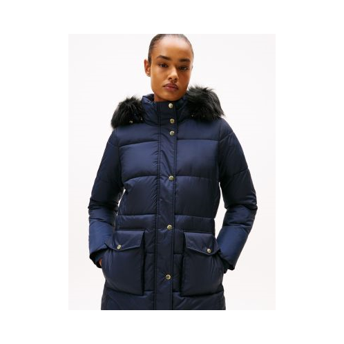 Tommy Hilfiger women's coat. The sturdy design of our puffer features a water-resistant shell, a detachable faux-fur-lined hood and elastic cuffs to seal in warmth while you stay comfortable. Lightweight insulation and plush lining at the collar and pockets keep you toasty, no matter how hard the cold winds blow.