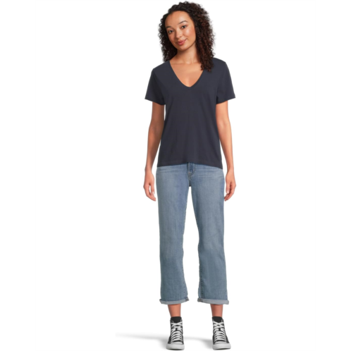 Boyfriend fit is a looser, straight fit that tapers lightly to the rolled cuffs.