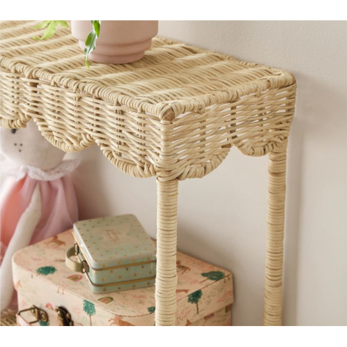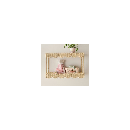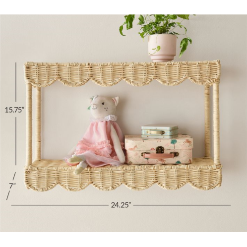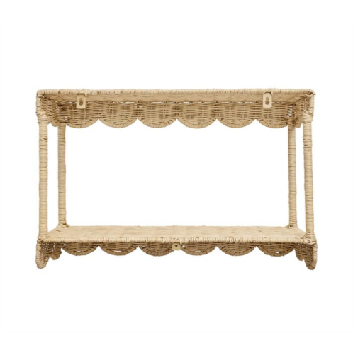 Give their favorite things a breezy display with our charming Palmer shelf. Woven from natural rattan and framed in iron for stability, it offers two scalloped tiers for showcasing books, photos, keepsakes and other treasures.