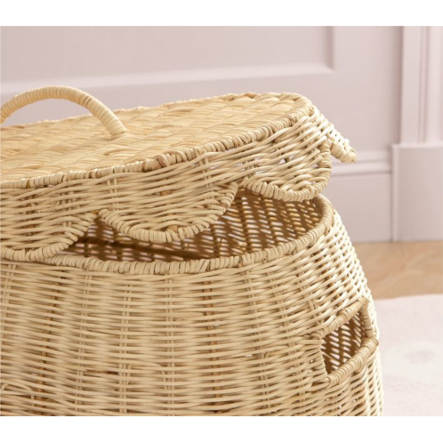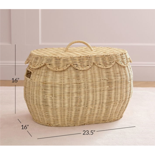 Give everyday storage some charming, breezy style with our versatile Palmer rattan trunk. Framed in iron for stability, the bin has plenty of room for everything from toys and games to extra clothing or linens. Cutout side handles make it easy to move, and the scalloped lid adds a charming touch while protecting the items inside.