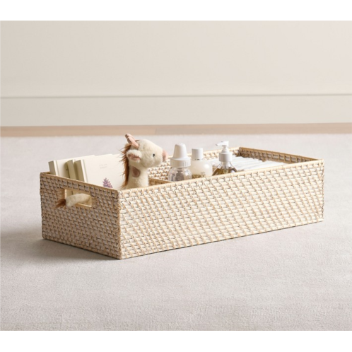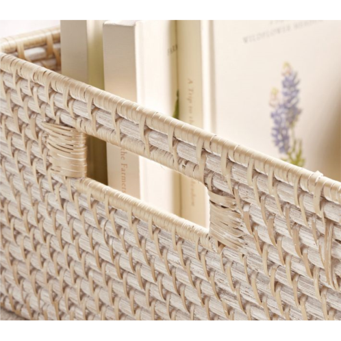 You’ll find countless uses for this versatile bin, from organizing nursery essentials to sorting books and toys. Woven around a sturdy metal frame, the whitewashed rattan complements any nursery or bedroom decor. Slight variations in color and finish are hallmarks of time-honored weaving techniques.