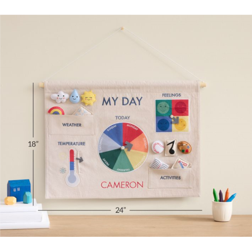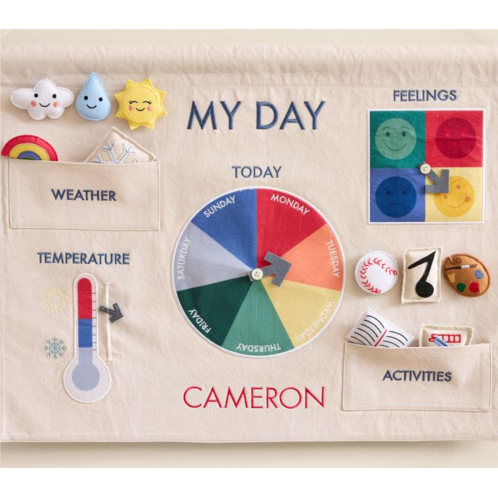 A fun way for little ones to learn about the world, our interactive wall chart helps them identify their feelings, the days of the week, the weather and everyday activities. As they move the dials and sliders, place the plush icons and identify colors and moods, they’ll be building fine motor skills, vocabulary and self-awareness.