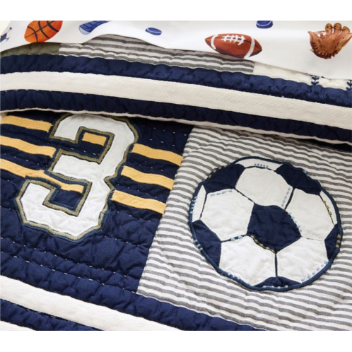 Game on! Cuddle your all-star in a cozy quilt that sports vintage-inspired athletic gear. Crafted from soft cotton fabrics, the classic patchwork is embellished with appliques and embroidery, then hand stitched over light cotton fill for natural, breathable warmth.