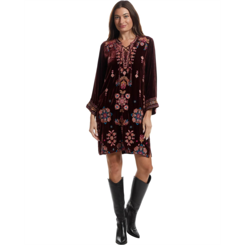 Velvet meets artistry in this Johnny Was Velvet Tie Front Kimono Dress- Brandi, where lush florals and rich wine tones create an effortlessly chic statement. This embroidered tunic dress is styled with elbow-length sleeves, a split neckline, and a straight hem. Made from a rayon blend, this above-the-knee dress works for different occasions.