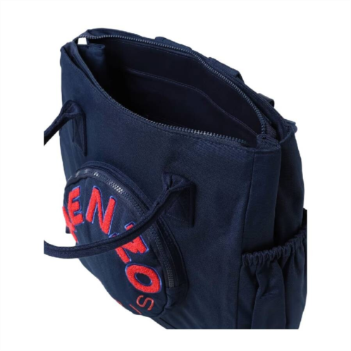 Kenzo Ladies Tote. SKU: K60021-84A. Color: Navy. Kenzo Logo-Print Changing Bag. This bag features a logo print, top handles, a changing mat, and is shaped like a backpack with adjustable straps. It has a zip closure, a front zip pocket, and slit pockets on two sides. 100 % Polyester, Lining 100 % Cotton, Trimming 100 % Leather.