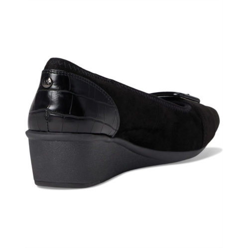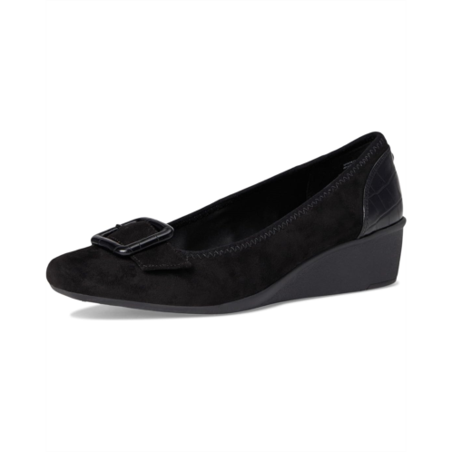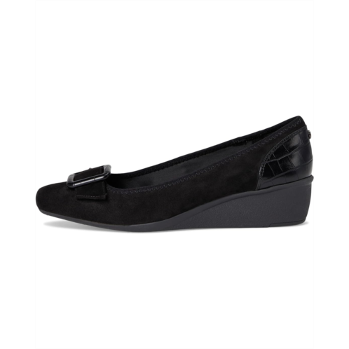 The Anne Klein Wyatt is a refined staple that features a squared toe and a suede upper, elevated by a patent-texture heel counter. The padded polyurethane insole ensures all-day wearability, while the rubber traction outsole provides stability with every step. Set on a sleek wedge heel, this versatile pump transitions effortlessly from office to evening.