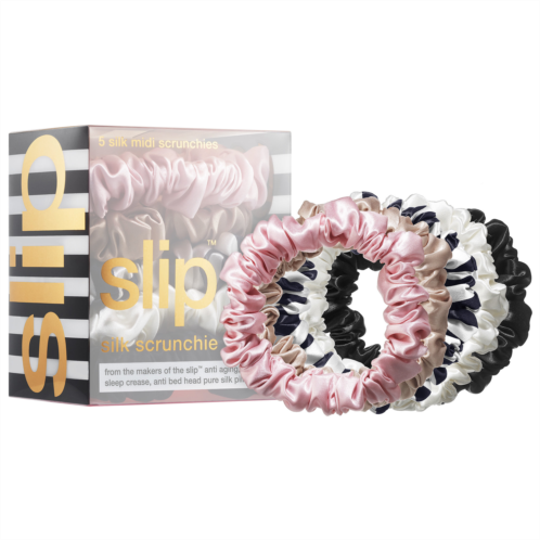 - 5 x slip midi scrunchies in black, pink, caramel, white, pink, caramel, white, navy stripe
