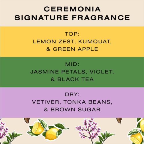 Fragrance Description: Ceremonia’s signature essence blooms with soft, woody notes and a delicate hint of lemon zest. South American tonka beans add a nostalgic sense of familiarity and uniqueness alongside subtle whispers of violet, black tea, vetiver, and brown sugar.