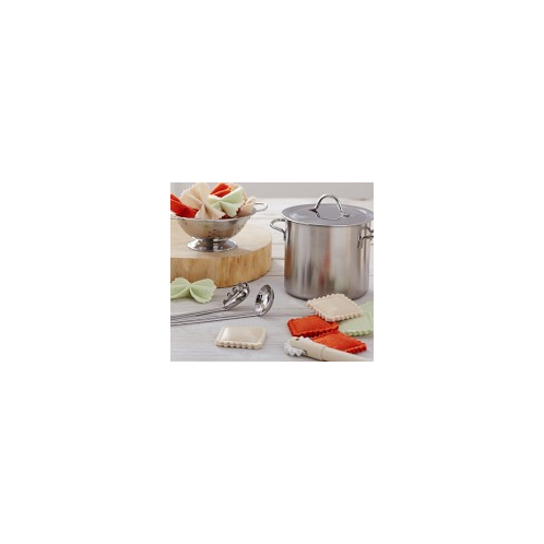 - Includes a pot with lid, a colander, a spoon, a spaghetti spoon, a pastry wheel and 15 pasta pieces.