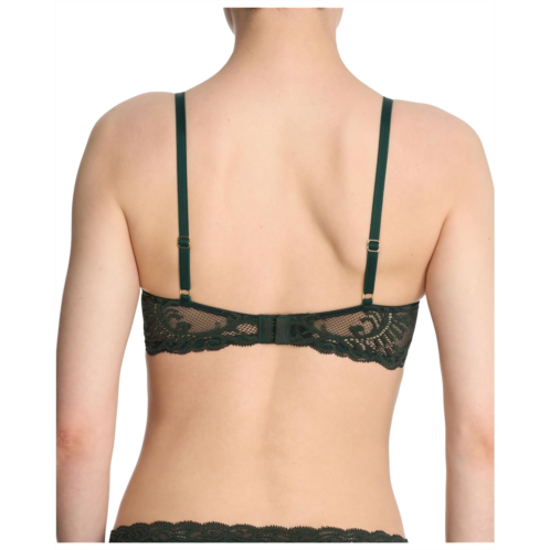 Feather lace unfurls on the cups, center connector, and band.