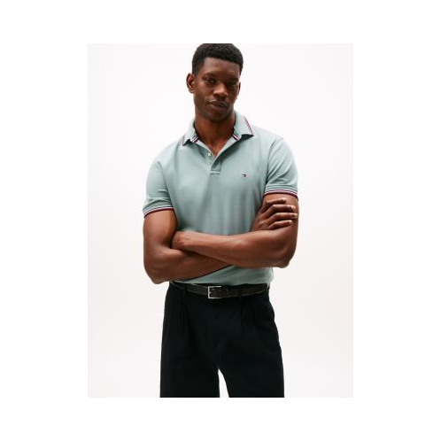 Tommy Hilfiger men's polo. A fresh spin on tradition, this regular-fit polo is made from quick-dry, wicking fabric with ultraviolet protection and features our signature stripe tipping at the cuffs and collar.