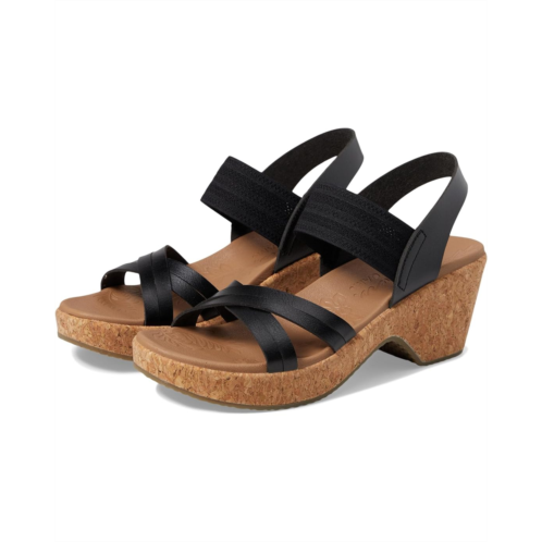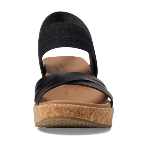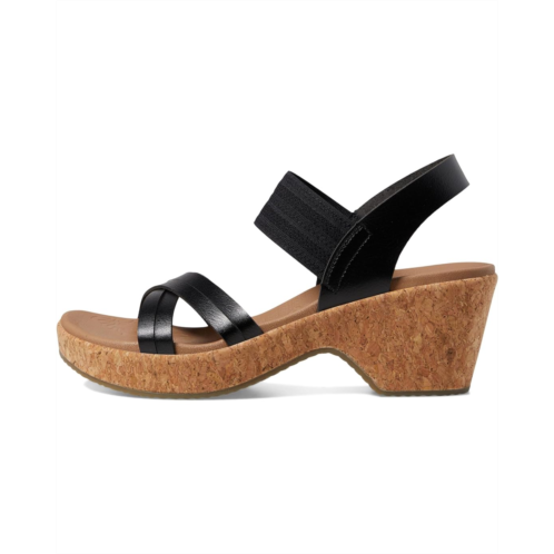 Make a stylish statement wearing the SKECHERS Brystol - Night Skies. Crafted with vegan materials, this strappy wedge sandal features a synthetic upper with a pull-on gore strap, and a cushioned Luxe Foam footbed. It comes with brand detailing on the footbed.