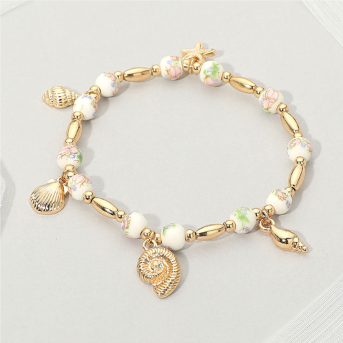 [US] FASHNZFAB metal shell puka shell starfish charm station ceramic ball beaded stretch bracelet - gold pink