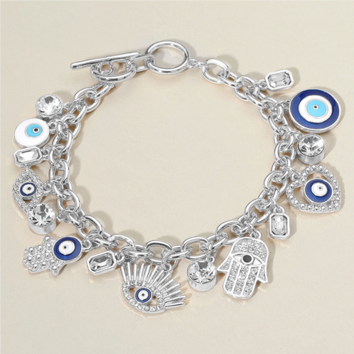 [US] FASHNZFAB enamel stone paved evil eye hamsa hand stone bezel charm embellished toggle bracelet