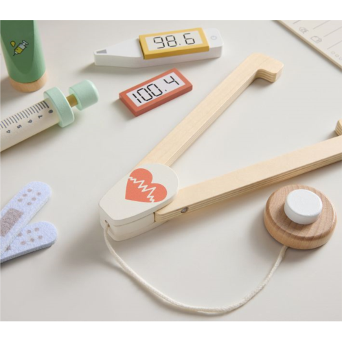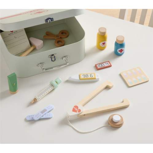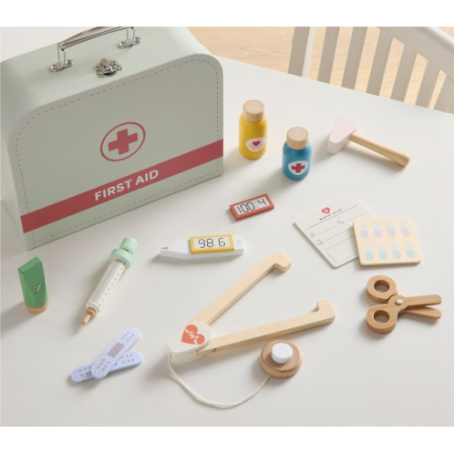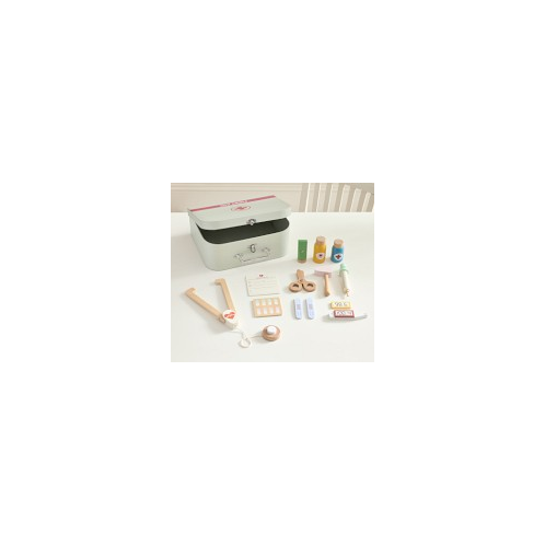 - 1 case, 2 thermometers, 1 stethoscope, 1 reflex hammer, 1 pair of scissors, 2 bandages, 1 play needle, 2 charts, 3 medicine bottles.