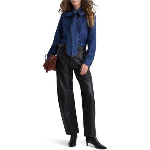 Make a stunning impression with the uber-stylish Madewell Denim Kimberly Top In Plumville Wash Shirt. The shirt features a collared neck with an oversized tie detail, long sleeves with buttoned cuffs, and a shirttail hem.