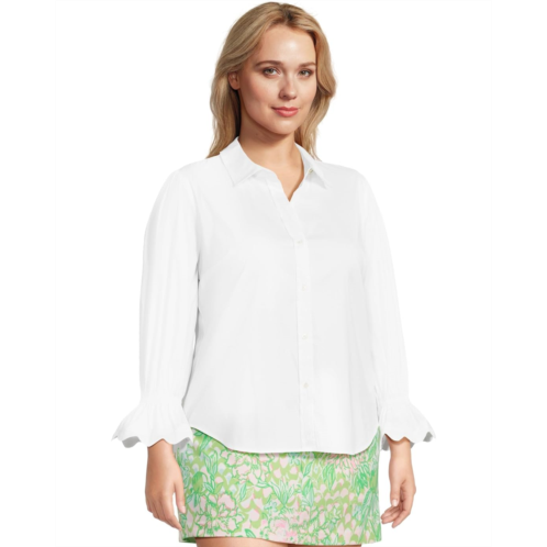Add a chic touch to your effortless style in the Lilly Pulitzer The Ricrac Lilly Shirt. This three-quarter sleeve top features a spread collar with a front button-closure in a straight fit. Skims the body. Roomier fit.