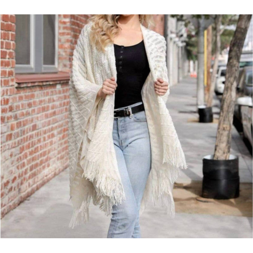 [US] LETO diagonal knit tassel ruana wrap shawl in ivory