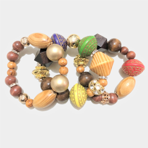 [US] FASHNZFAB 3pcs - patterned colorful wood accented stretch bracelets multi