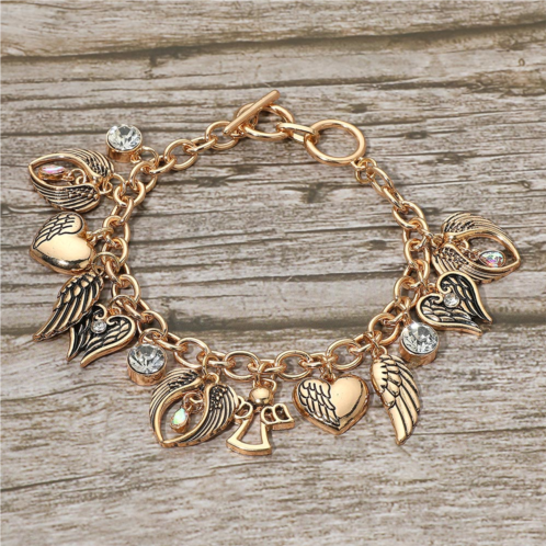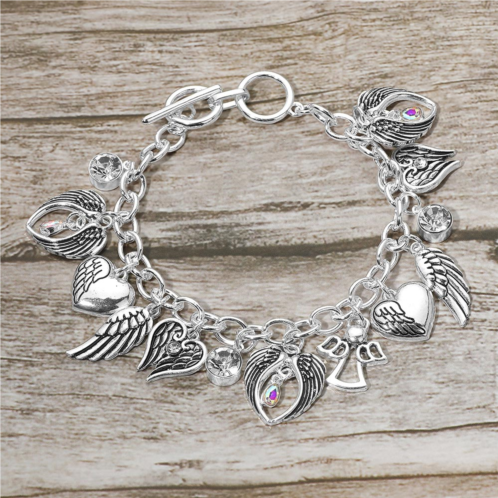 Size - 0.25' H, 7.5' + 1' LCharm Size - 0.9' LToggle ClosureShowcase your style with this angel wing charm bracelet featuring heart pendants, angel motifs, and sparkling crystals. A meaningful and elegant accessory symbolizing love and protection, perfect for daily wear, special occasions, or as a thoughtful gift for someone special.