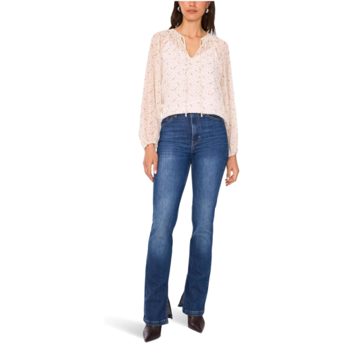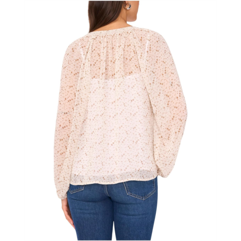 Shine effortlessly wearing the Vince Camuto Tie Neck Shirring Long Sleeve Top, while elegance meets comfort. The pull-on style top features a V-neckline with tie-up detail, long sleeves, a straight hem, and a subtle allover print.