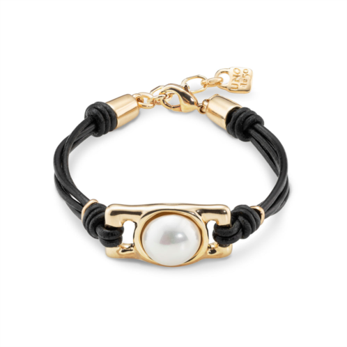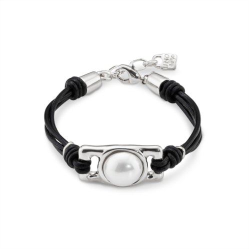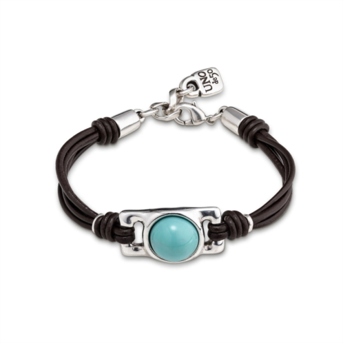 - Leather bracelet finished with a polished rectangular bead and soft accents.