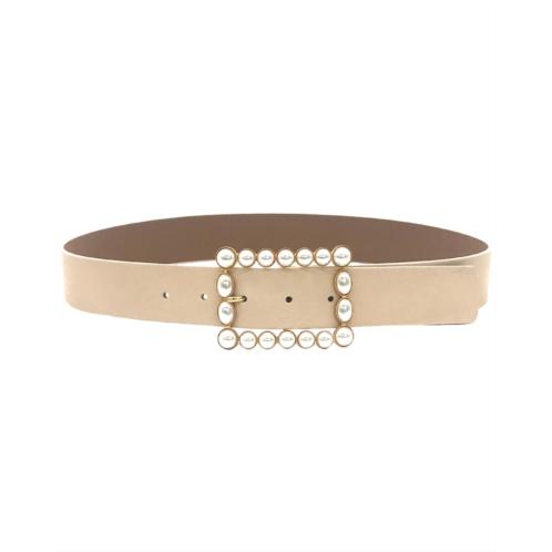 Introducing the B-Low The Belt Joan Leather Belt, a must-have accessory for any fashion-forward woman. This stunning belt features a latte gold color and is crafted from 100% genuine cow leather. The design details include zinc alloy hardware and acrylic pearls, adding a touch of luxury to any outfit. The belt measures 1.375 inches wide and is packable, making it perfect for traveling. Made in Italy, this stylish belt is finished with a buckle closure. Please note that all measurements were taken by hand and are approximate, so slight variations may occur. Add a touch of elegance to any outfit with the B-Low The Belt Joan Leather Belt.