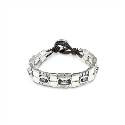 - Dual metal layers hold gray crystals between beveled plates for an everyday edge.