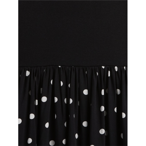 - Soft ribbed top, smooth woven skirt.