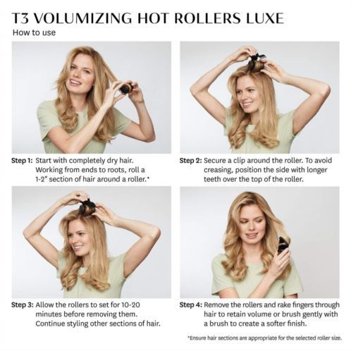 What Else You Need to Know:Sensational volume, body, and shine?all rolled into one. Featuring new T3 HeatCore technology, the Volumizing Hot Rollers LUXE heats up fast and ensures optimum, balanced heat transfer for lasting volume, body, and shine. Dual temperature settings ensure long-lasting style for all hair types. CoolGrip rollers with velvet flocking are easy to handle and make wrapping a breeze. Includes eight velvet flocked rollers: four XL (1.75-inch) ideal for creating voluminous waves and four LG (1.5-inch) ideal for creating soft waves, eight crease-free clips to hold rollers firmly in place while preventing creases, and a luxurious case for easy storage and travel.