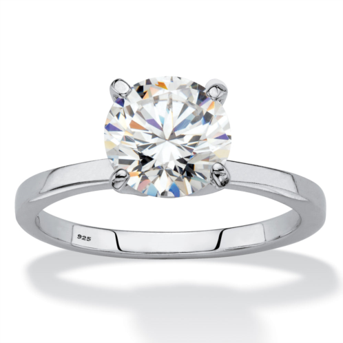 An iconic symbol of commitment, the classic solitaire engagement ring is dazzling in its simplicity and striking beauty. This beauty is the perfect example featuring a spectacular round lab created white sapphire in a platinum-plated sterling silver setting. 1.85 carats. Sizes 6-10.