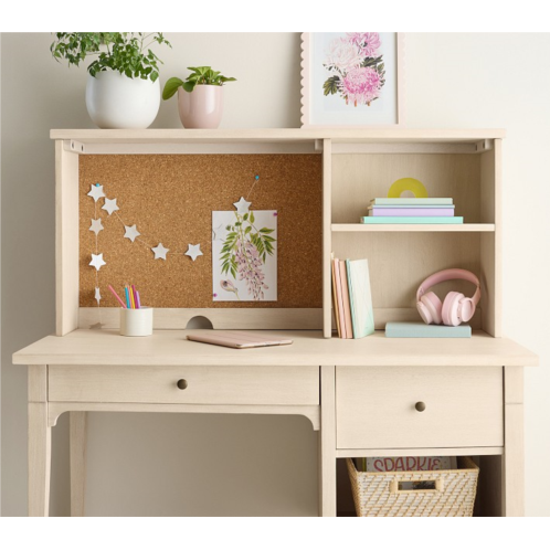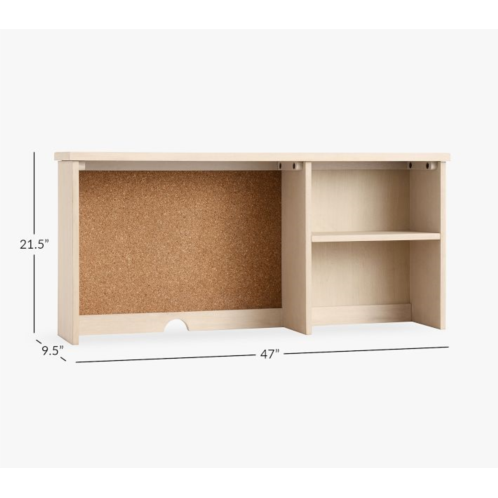 - Hutch is crafted with a cord cut out, two shelves and one cork pinboard.