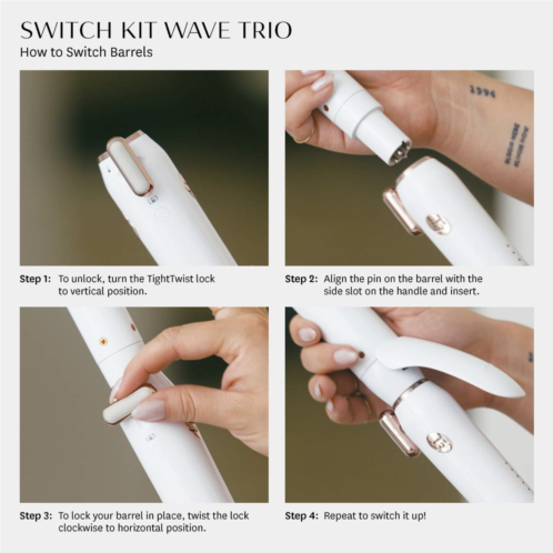 What it is: An interchangeable curling iron with a 1” wand barrel, 1.25” clip barrel, and 1.5” clip barrel for endless looks with a shiny, long-lasting finish. All T3 Switch Kits are not compatible with the original T3 Convertible Power Base.