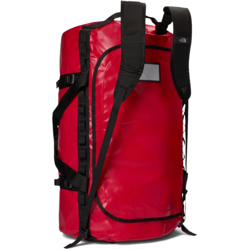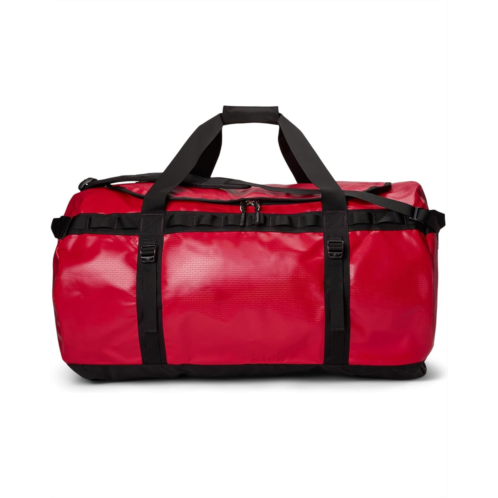 - Stay ready for anything and everything with The North Face Base Camp Duffel 1-XL bag. Crafted from 1000D recycled polyester with phthalate-free PVC coating, this bag features D-zip opening with a weather-resistant, zippered flap, and four compression straps. Legendary rugged construction offers water-resistant base camp material, extra Bartacks and double stitching, main compartment has a secure-zip mesh pocket and an end-cap mesh sleeve pocket for more organization. Mesh-bag packaging helps keep the duffel clean, removable, adjustable, alpine-cut shoulder straps for an ergonomic fit with minimal twisting.