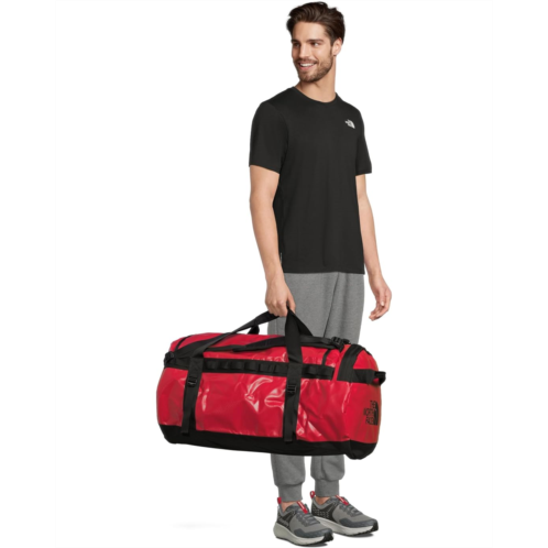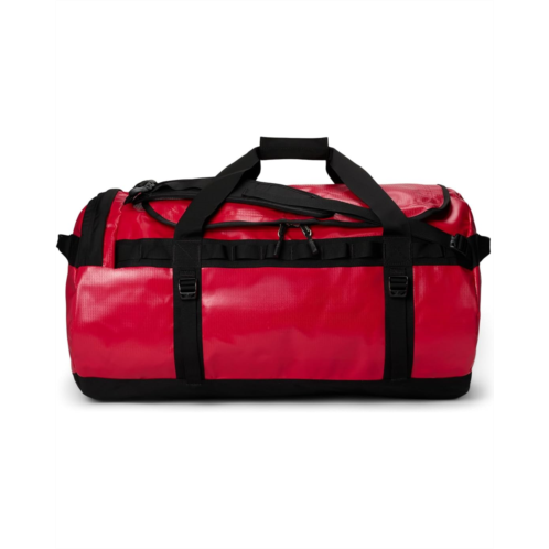 - Made from 1000D polyester with phthalate-free PVC coating and Non-PFC DWR finish, The North Face Base Camp Duffel 1-L is designed for camping and outdoor adventures. Water-and-tear-resistant, this duffel bag provides protection against rough handling and even rougher weather. It features mesh-bag packaging that helps keep it clean while the extra bartacks and double stitching ensure durability. This camping bag comes with four compression straps, two removable and adjustable alpine-cut shoulder straps, and two padded side handles that serve as both duffel carry handles and haul handles. Designed with a water-resistant ID window on top, this duffel bag will become your favorite travel companion.