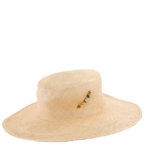 Van Palma Ladies Hats. Fashion category - Hats. SKU - ALBA-BEIGE. Color - Beige. Van Palma Beige Alba Straw Large Brim Sun Hat. The Van Palma 'Alba' handwoven straw hat features a flat crown, a wide brim for UV protection, and a gold-plated metal accent for a refined touch.
